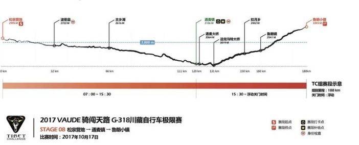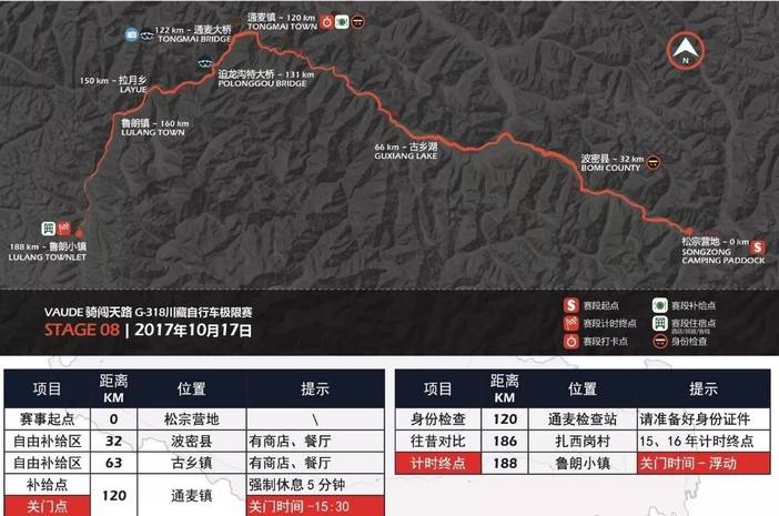 来到骑闯天路的第八赛段,比赛正式进入林芝地区,闯爷的车轮更接近拉萨。而为了能够成功骑到拉萨,面对赛事浮动关门时间的新规则,每一次关门机会都显得异常重要。这一天闯爷闯妹从松宗营地出发,经历一开始的长达120公里的下坡和大约70公里的起伏爬坡,到达美丽的鲁朗小镇,途经波密县、通麦大桥和鲁朗镇,全程188公里,关门实际浮动(冠军冲线车手时间男×1.2; 女×1.4)。