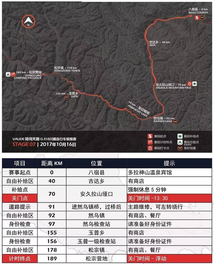 果不其然,想比前几天,今天的比赛让人血脉喷张。第7赛段,选手从八宿县出发,将会进入植被茂盛的林芝地区,并抵达比赛的第三个营地——松宗营地,途径绝美的然乌湖。比赛仅在海拔4469米的安久拉山垭口设置了一个补给/打卡点,全程189公里,关门时间浮动。