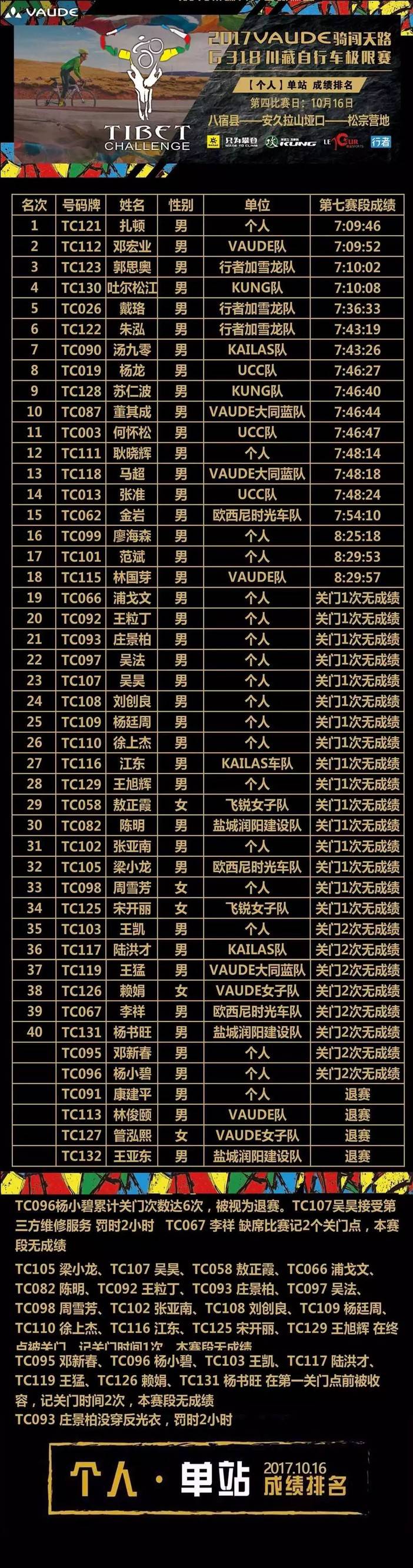 今天是浮动关门,第七赛段冠军TC121 扎顿,冲线时间15:26:11。对应的男子关门时间是16:52:06。女子关门时间 17:35:09。最终,25人被收容,18人完赛。骑闯天路,只有更残酷。