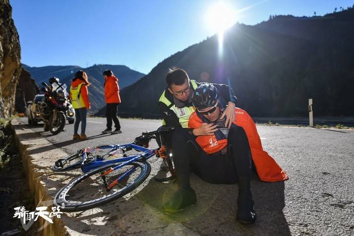 昨日拼劲全力爬上东达山的刘春阳,在今日发车后不久便发觉身体不适。一边骑行一边休息经过10公里比赛路段后,被组委会发现,并及时叫来医疗组进行检测治疗。经过医疗组检查判断,他的身体勉强可以继续骑行,不过时间却不足以支撑他成功赶到打卡点,最终,他选择今日弃赛。
