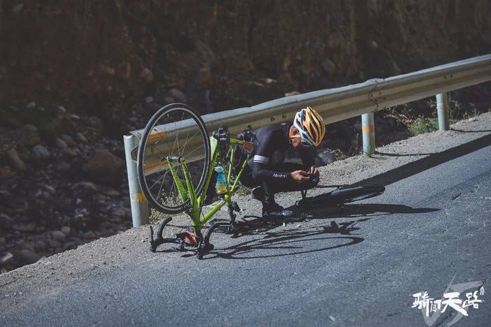 骑闯天路的每个赛段都会有不少闯爷闯妹遭遇爆胎,上图为闯爷魏迎安爆胎后自行修补。