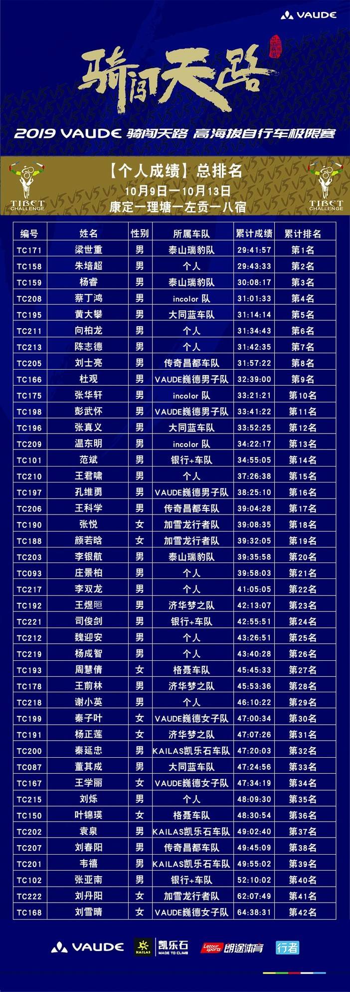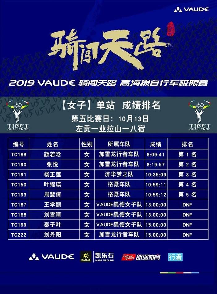 虽然朱培超在今天比赛的后期表现的十分顽强,但是最终在总成绩排行榜上,依旧没能守住,梁世重在本赛段后,重回总成绩榜首。女子组方面,来自加雪龙行者车队的颜若晗获得第五赛段冠军。