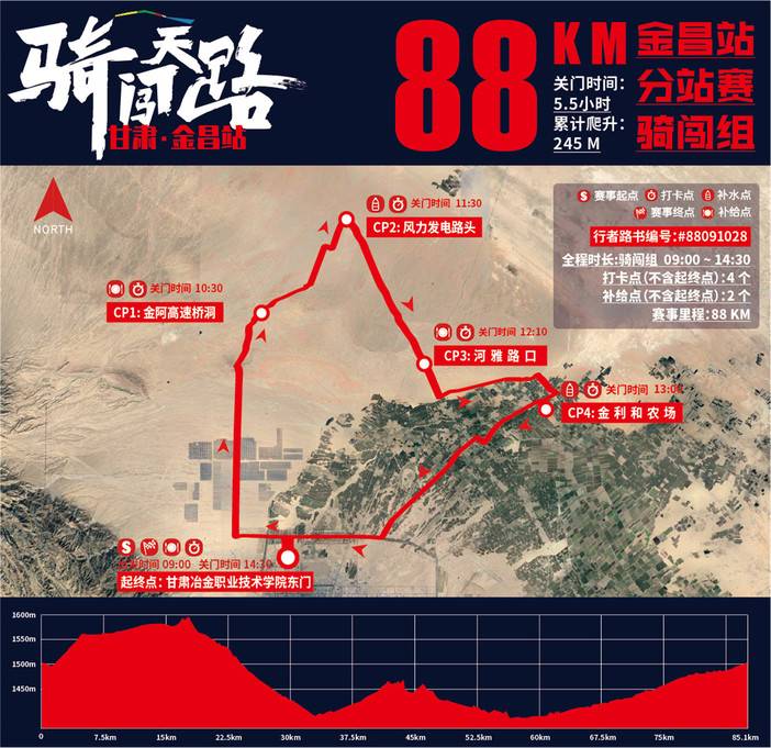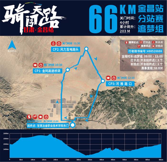 比赛途经紫金花海、植物园、玫瑰谷、十里花廊、戈壁河滩、光伏电厂、风力电厂、喇嘛墩烽火台、黑水墩烽火台、西北沙丘绿洲金利和农场、体育特色小镇大漠营盘等金昌特色景点遗迹。独特的戈壁滩途充满挑战,美丽的花海长廊引人入胜,而现代的光伏风电凝聚着科技的力量,悠久的千年烽火见证岁月的流转,这一回,我们用车轮丈量祖国镍都的时代变迁,身临其境感受金昌新发展。