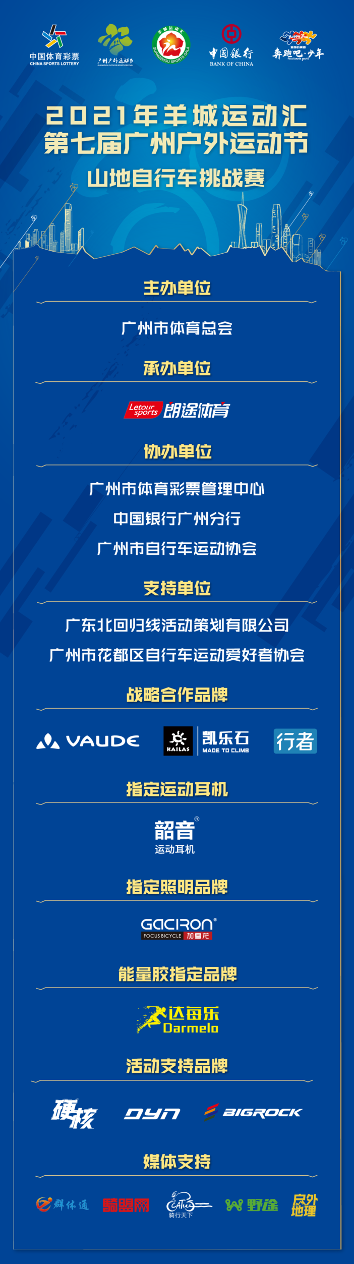 本次山地自行车比赛是“羊城运动汇”全民健身品牌赛事活动之一,以“爱户外、享自然”为主题,围绕群众体育赛事的特点,按难易程度分别设计了两条各具特色的赛道,并设有公开组、青少年组以及体验组三个组别,让更多的市民朋友可参与其中。