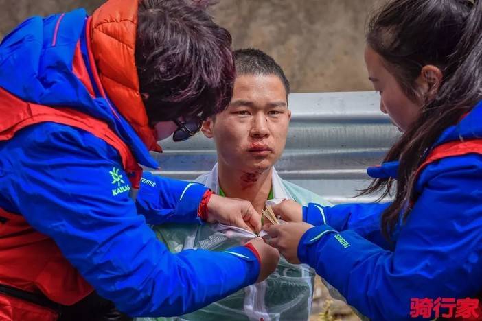 最致命的第四赛段,经过前一晚的露营,小熙的高反并没有好转,清晨起来感觉依旧晕眩。但不想浪费机会的她还是选择慢慢的开始了当日的骑行,虽然出门爬坡缓慢,想着接下来的下坡能慢慢恢复体能,结果却在湿滑的下坡路段发生了两连摔的事故:第一摔没无大碍,路过的车辆把她扶到路边,摩托大爷也瞬间赶到,在他们的鼓励下选择继续上路。谁知道没过几秒钟她又狠狠地摔在了马路中间,这一摔直接把她摔哭了,摩托大爷把她搬到路边防止二次伤害,找到济华骨科检查治疗之后发现已经不适合再继续第二天的赛段,需要好好休养,左腿和膝盖充血严重导致她行动不便,小熙不得不选择放弃第五赛2段。