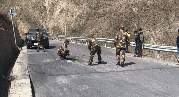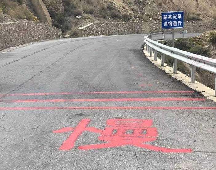 事故发生后不到1个小时,G318国道的武警交通部官兵们就赶到现场,对塌陷路面进行勘测做了维修部署,并画上了警示带、树立了警示牌,为他们的高效点赞!
