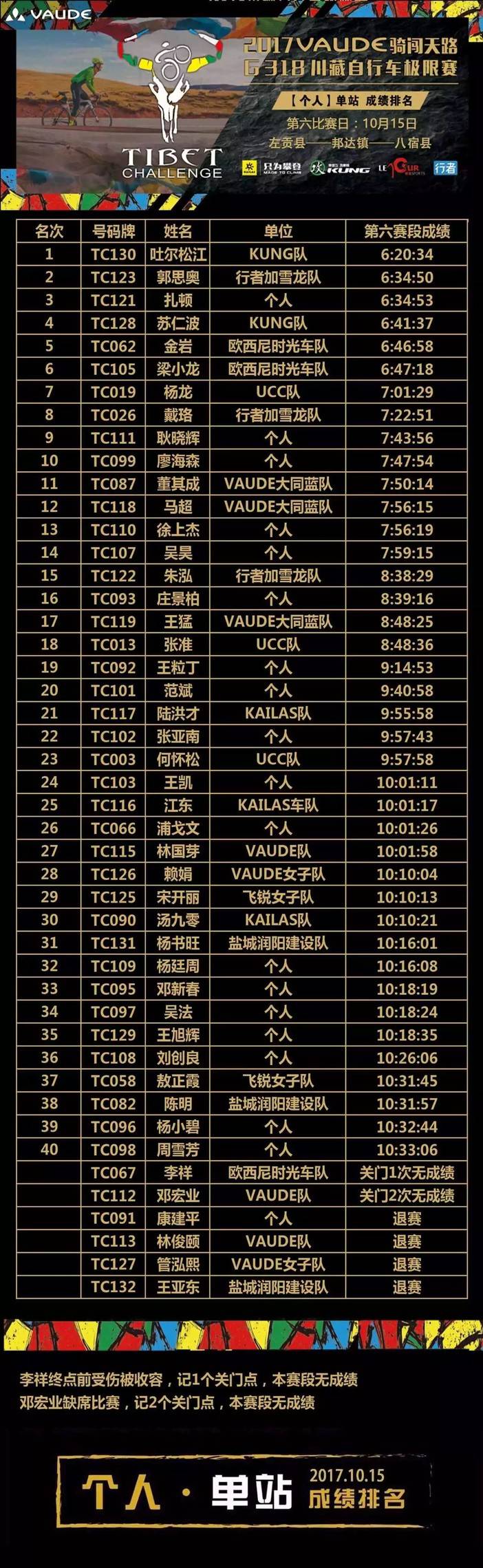 今天的比赛结果也创了骑闯天路历史之最,除了退赛选手,所有参赛选手在第六比赛日无一被关门,全部完赛。