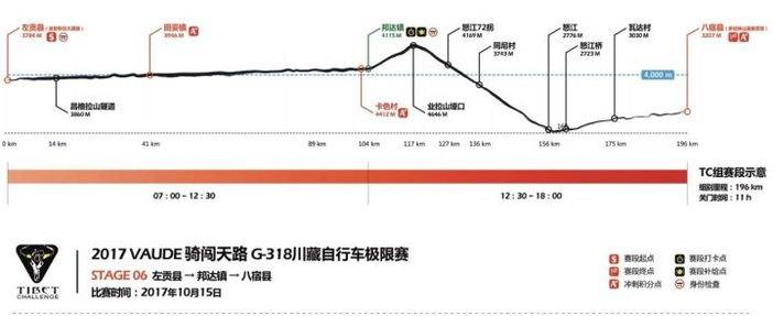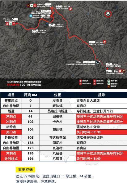 2017年VAUDE骑闯天路第六赛段,从左贡县出发至八宿,途径著名的怒江72拐,这是一条前往拉萨的必经之路,2000米的海拔落差,无尽的下坡和急转弯考验着每一个选手的下坡技术与骑行安全。今天的比赛仅有一个补给点——邦达镇,全程196公里,关门时间11小时。