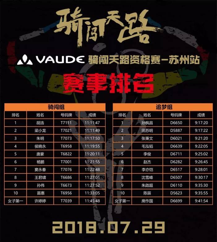 随着比赛的深入,第一集团的人数也在逐渐减少,行至莫厘峰脚下,高难度的爬坡瞬间便将集团拉散。这几公里的爬升,导致众多车手只能推车前进。而第一集团只剩3人。最终,在小集团冲刺中,胡浩率先过线,获得了苏州站的冠军,用时4:11:47。梁小龙和朱明获得二、三名。骑闯组女子第一名许婷婷,用时4:33:05。追梦组第一名孙枫昌,追梦女子第一名席作国。