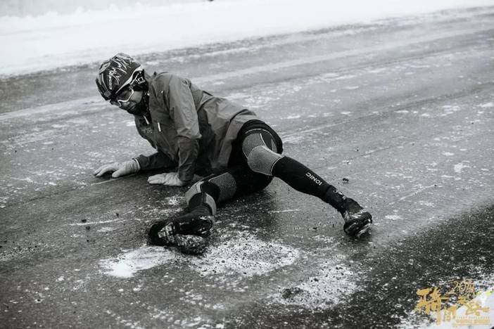 可即使再谨慎,在光滑的路面难免会发生意外,不少选手在低速下也发生打滑,摔倒在地面上。