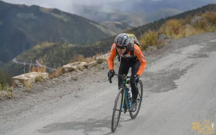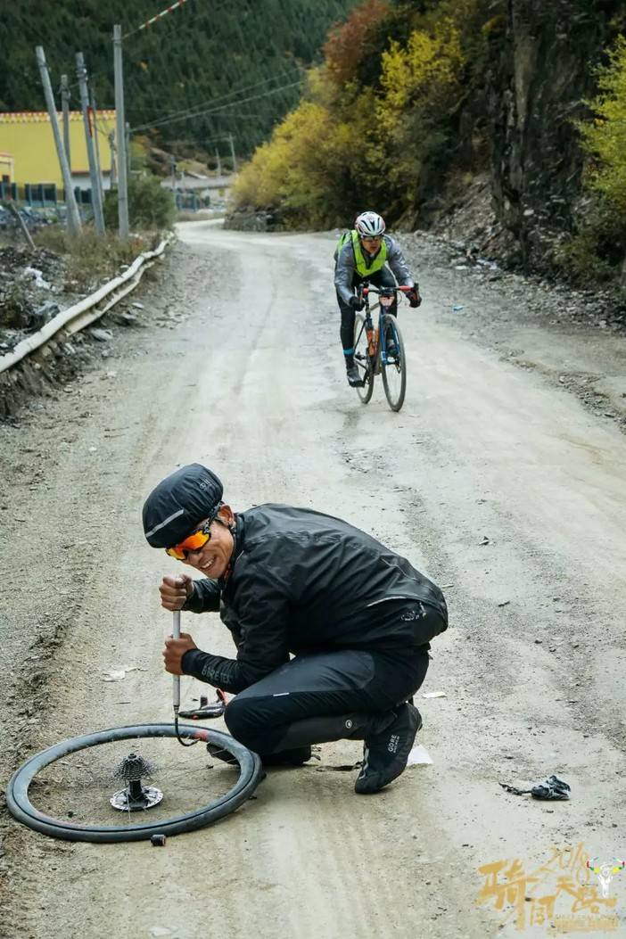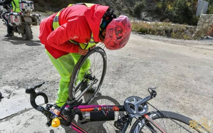 就算是控车能力强大的吐尔松江,一路上也摔了2次车,后拨出现了故障,最大的3片飞轮无法使用。在经过雅江后,还有一段20KM,爬升1000M的爬坡。由于齿比太大,吐尔松江只能以较低的踏频骑行。