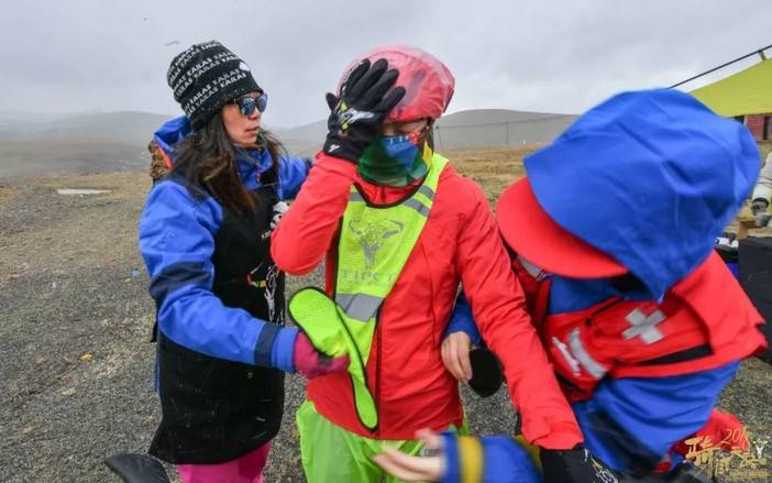 第二补给点位于高尔寺山垭口,海拔达4412M,部分选手出现不适,医护人员上前查看情况。