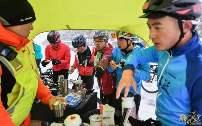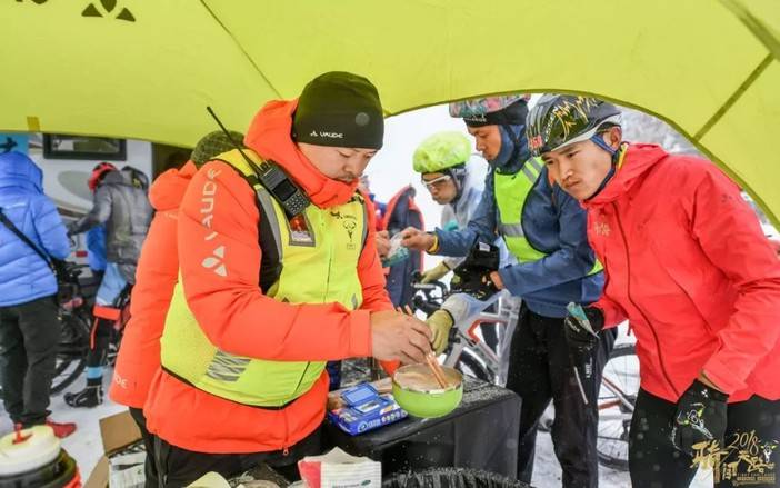 天气寒冷,选手大多穿上了VAUDE的防风风衣、鞋套等御寒装备,这能让选手在恶劣天气下保持体温。