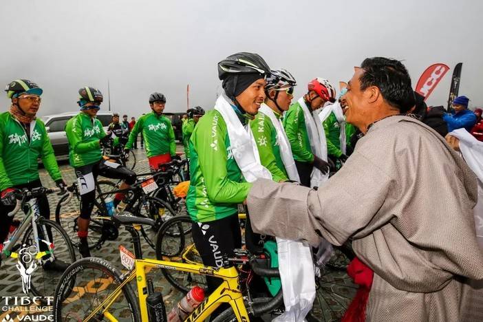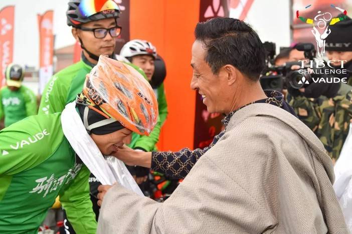 10月10日,在阳光的眷顾下,2016VAUDE骑闯天路318川藏自行车极限赛在折多塘开启了第一比赛日的征程。热情友好的藏族老先生为每一位车手献上哈达,TC003何怀松接受哈达!
