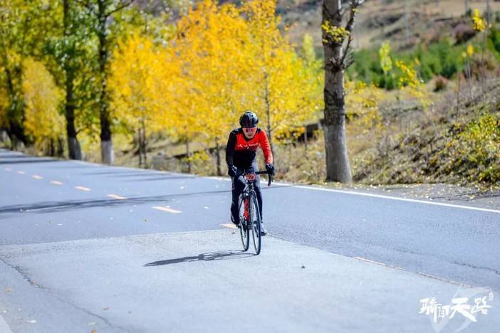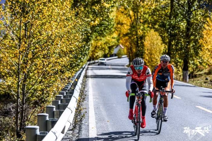 VAUDE巍德男子队车手正经过一片金灿灿的树林,十月,新都桥的秋意正浓。