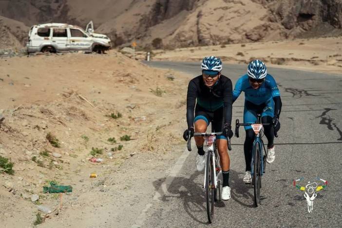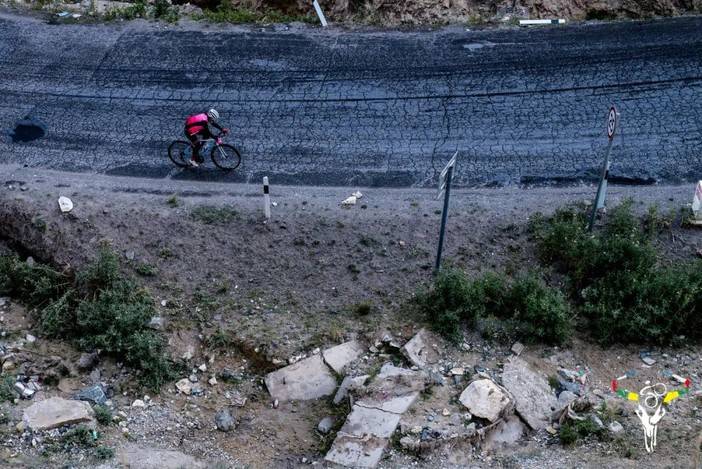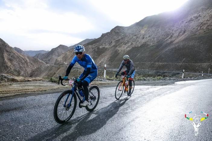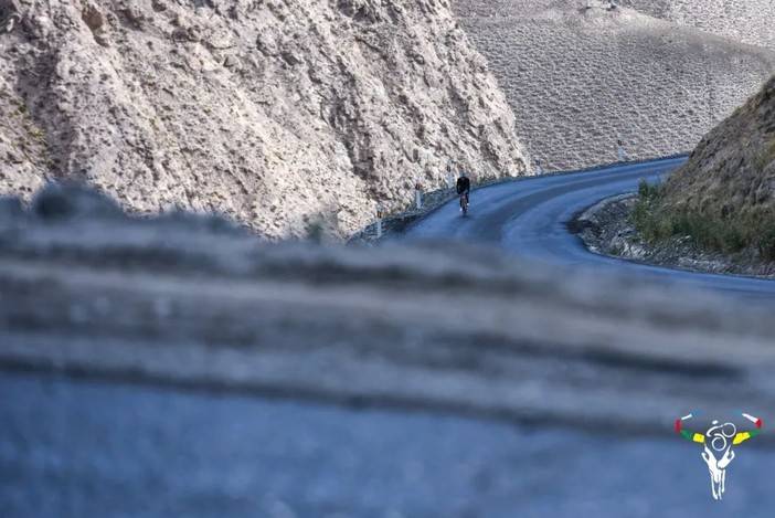虽然今天的赛程较短,但是新疆整体来说温差较大,加之早上零星飘落的小雨,使得体感温度变得更低。比赛开始即进入爬坡,海拔上升约1000米。新藏线相对来说道路较为狭窄,进入爬坡之后和昨天的风景迥然不同,开阔的荒漠变为高耸的山体和沟壑,219国道在山间蜿蜒。由于新藏线也是一条进藏的重要补给线,因此一路上车辆也较多,尤其是重型卡车。道路整体情况较好,只有部分路段柏油路被压烂,道路上布满碎石,车辆经过掀起巨大的灰尘。