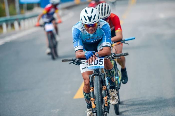 男子公路精英组前三:陈俊铭、马泽全、李秋。前三名的均速达到了42km/h。